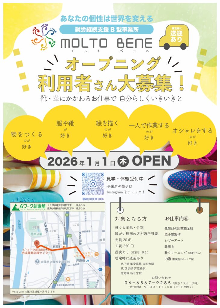 2026年、A´ワーク創造館2階に新たな就労支援施設が誕生します。その名も『MOLTO BENE(モルトベーネ)』。製靴業をテーマとする就労継続支援B型事業所は、その取り組み自体が新たな領域への挑戦です。大阪地域職業教育訓練センターであるA´ワーク創造館も... -
