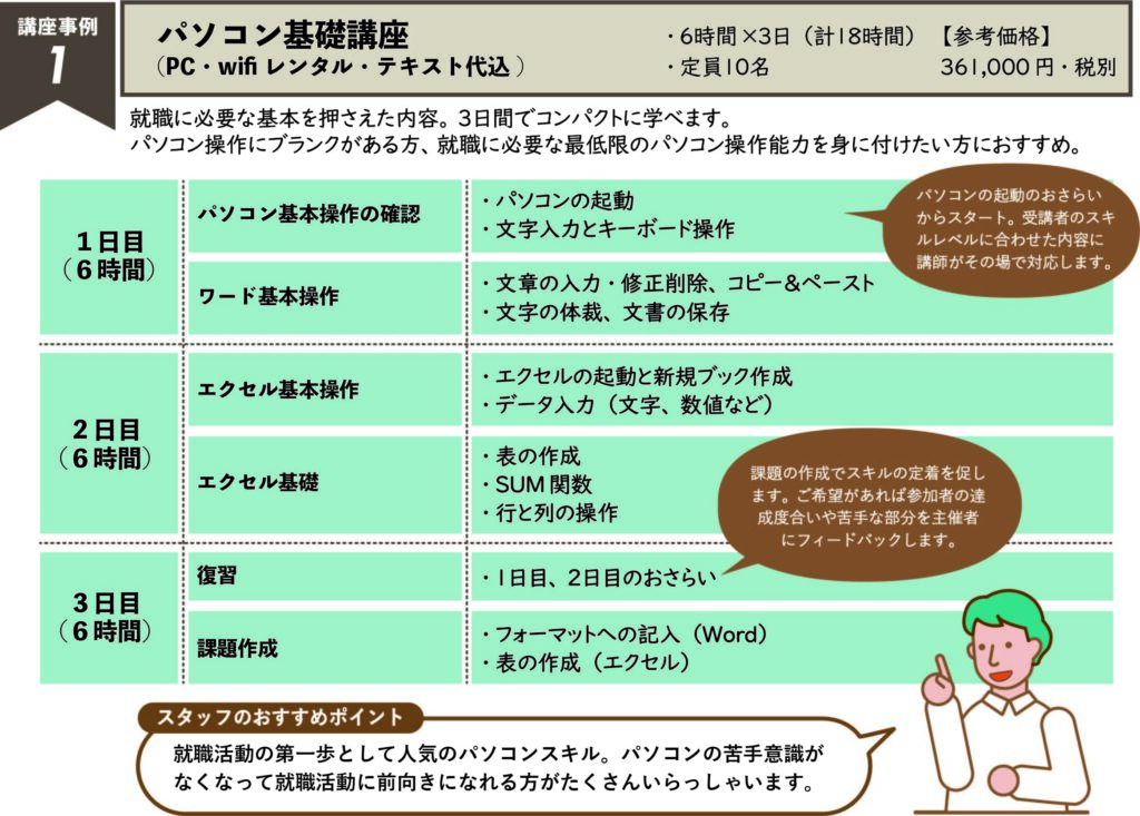 社員向け研修から就労支援講座まで、幅広い講座実績があります。特に求職者支援に係る豊富なノウハウを持っており、就労支援講座に強みを持っています。