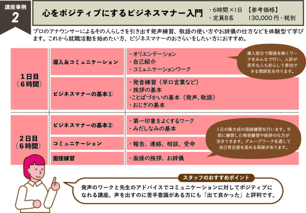 ・基礎スキル:接遇(電話対応・クレーム対応)、傾聴入門、パーソナルカラー講座、